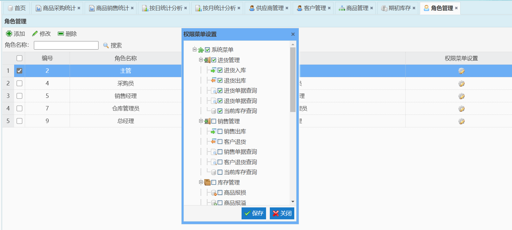 进货管理(进货入库、退货出库、进货单据查询、退货单据查询、当前库存查询)、销售管理(销售出库、客户退货、销售单据查询、客户退货查询)、库存管理(商品报损、商品报溢、库存报警、报损报溢查询)、统计报表(供应商进退货单统计、客户进退货单统计、按日统计销售利润、按月统计销售利润)、供应商管理、客户管理、商品管理、期初库存管理、权限管理模块(角色管理、用户管理)、查看系统日志、修改密码、安全退出