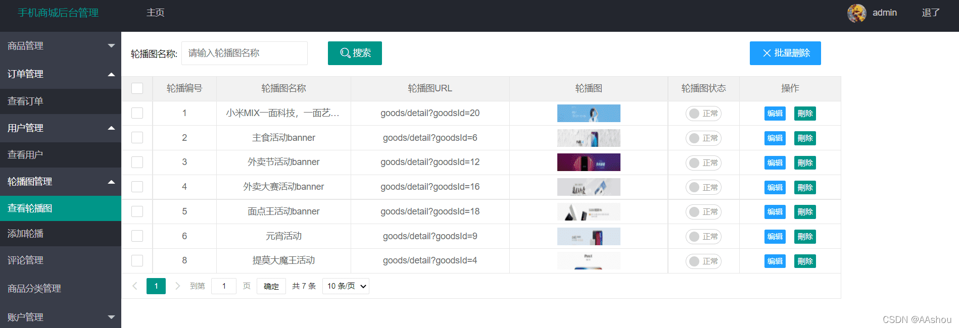 后台管理:查看待办事项-总订单量及待发货量,热门商品浏览量-是根据用户收藏后的点击量计算,手机销量排行、销售额折线图。 订单管理-编辑、删除、发货。用户管理-编辑删除查询用户。轮播图管理-编辑删除搜索天龙轮播图。评论管理-查看删除评论。 商品分类管理-添加删除编辑分类。修改管理员密码